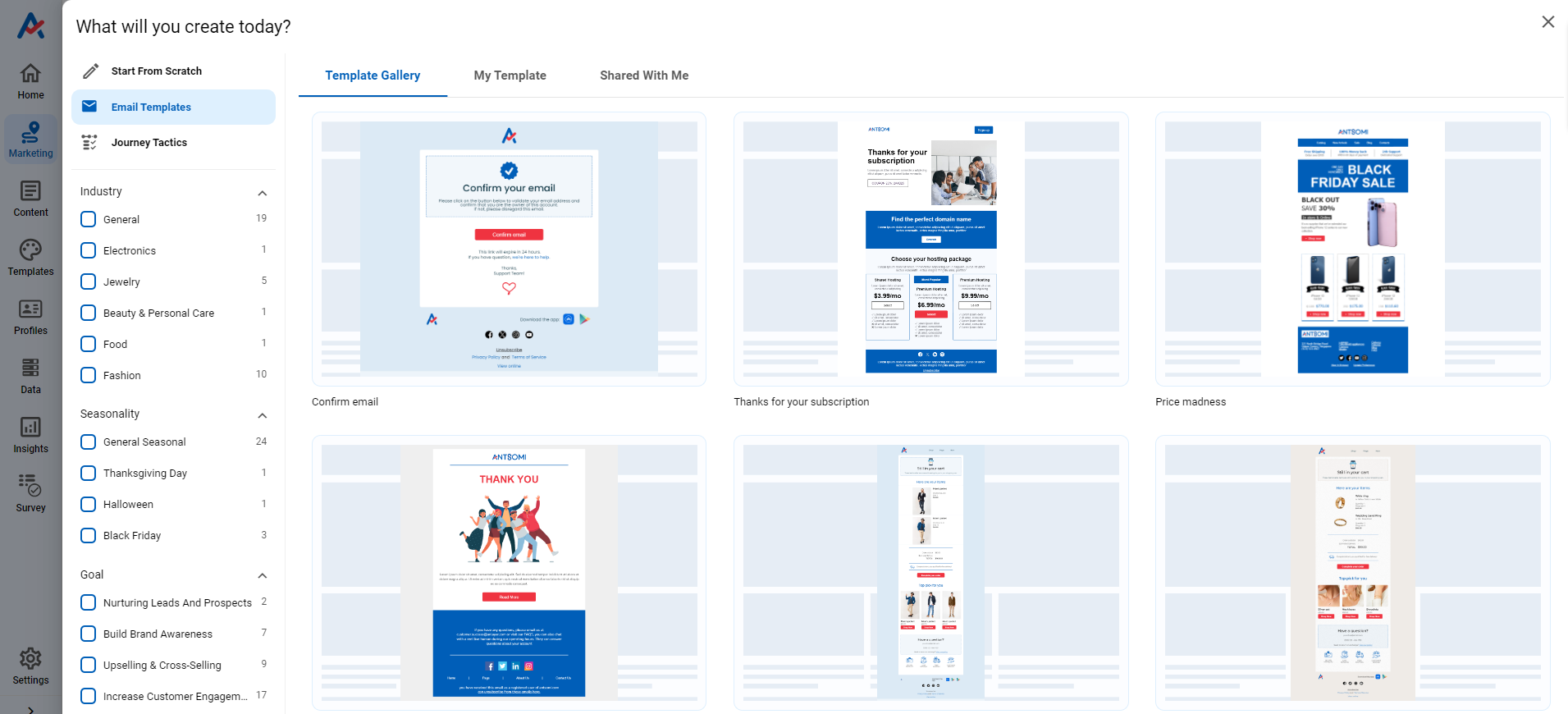 Template types include Popup, Floating Bar, Fullscreen, Inline, Slide-in, and Gamified