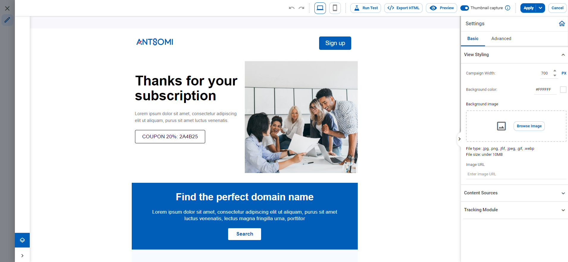 * **Settings**: you can add blocks to your campaign, and the configuration settings are available for the template or individual elements as you customize the design