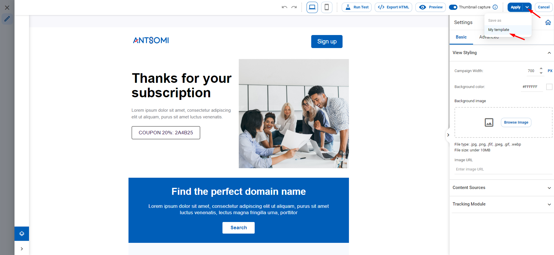 3\.    Click on the arrow next to Apply button, and choose My Template to save.