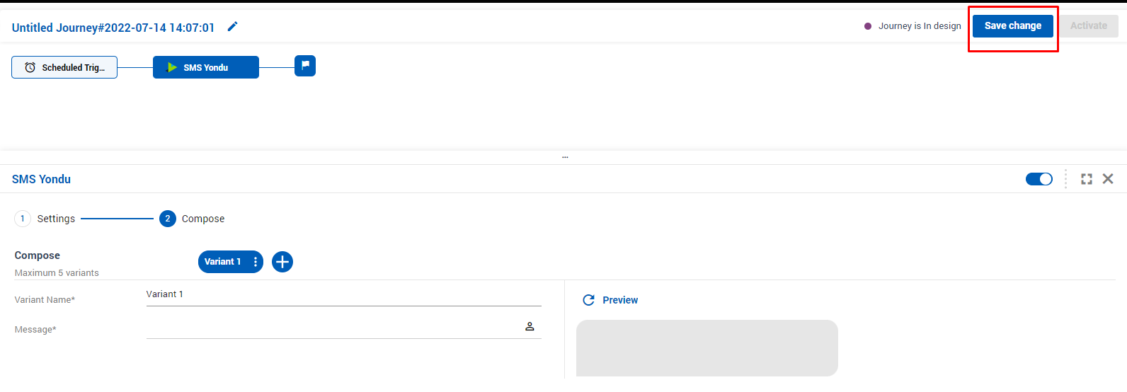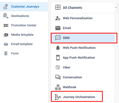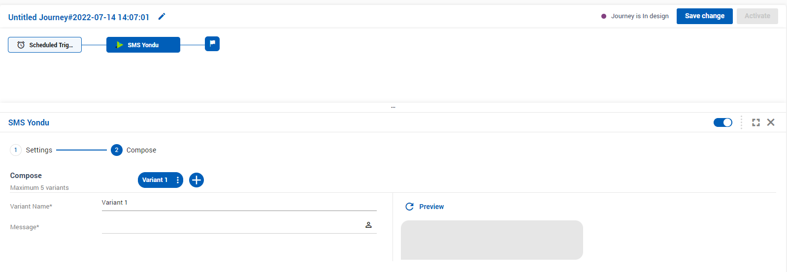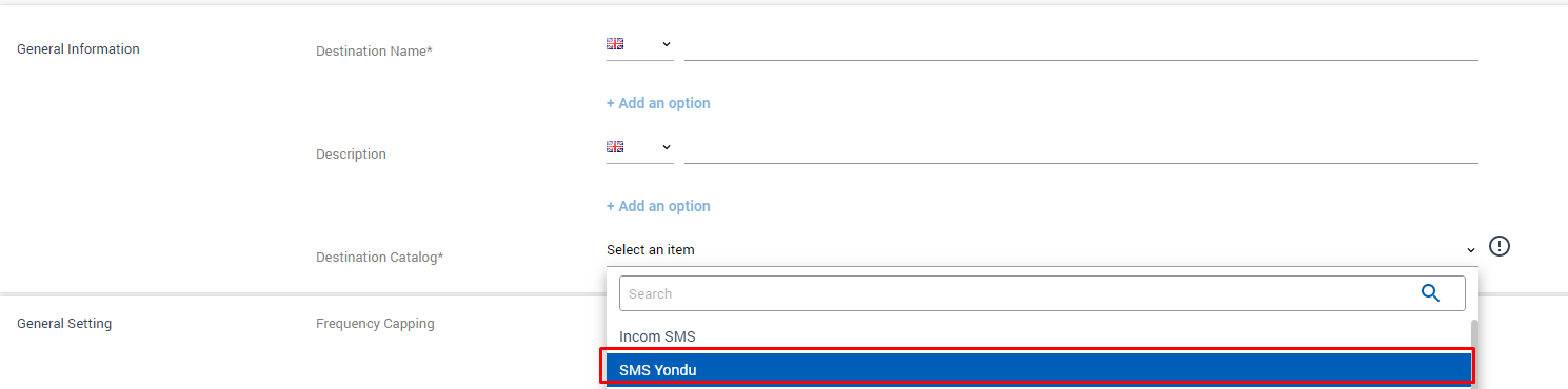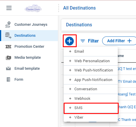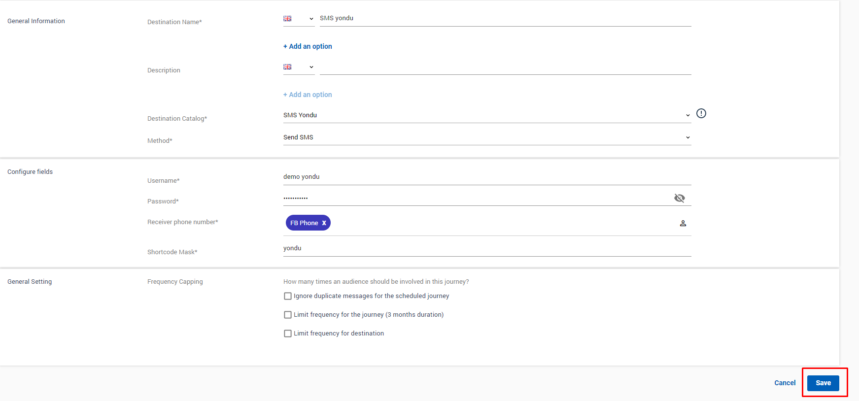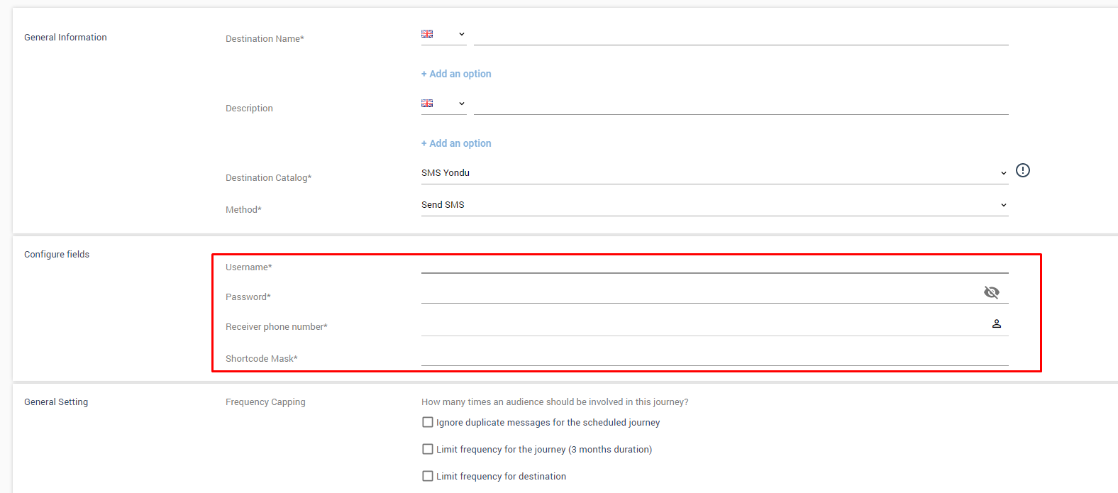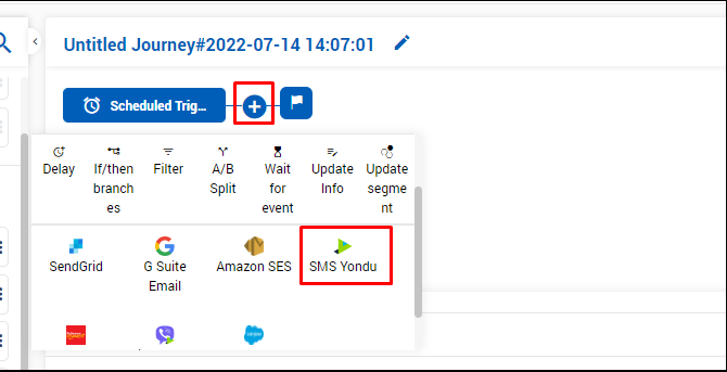 Click "+" button to Create Journey, add "Destination" node and select "SMS Yondu" destination