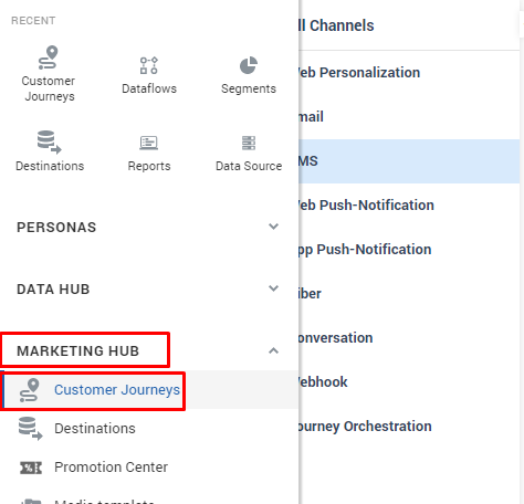 Log into CDP system,  access **"MARKETING HUB"** app and go to **"Customer Journeys"** menu