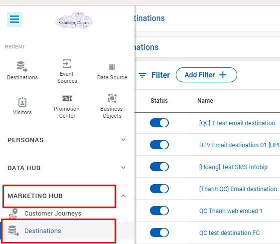 ### 1. Access "MARKETING HUB" app and go to "Destinations" menu