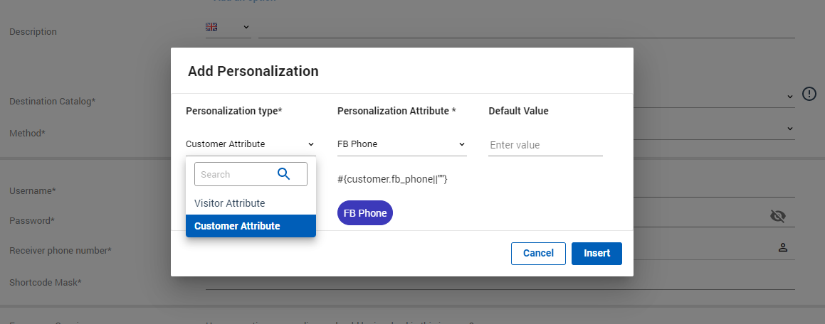 "Personalization Attribute": List of attributes of Visitor/customer that you selected at Personalization type -> Select the attribute containing the customer's phone number that you want to send SMS